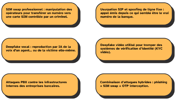 À ce jour, les attaques observées au Maroc présentent un caractère relativement rudimentaire ; toutefois, le contexte international met en évidence la rapidité avec laquelle une menace peut se transformer lorsque des groupes criminels initient l’exploitation des données disponibles. Dans divers pays d’Afrique et d’Europe, la divulgation d’informations personnelles identifiables a favorisé le développement de techniques plus perfectionnées, en particulier le « SIM swap », qui déjoue les mécanismes d’authentification à usage unique par SMS (Short Message Service), ainsi que l’usurpation de lignes fixes bancaires par le biais de la compromission de commutateurs téléphoniques privés et l’usurpation de protocoles d’ouverture de session, rendant un appel frauduleux pratiquement impossible à distinguer d’un appel légitime. L’émergence du clonage vocal et des hypertrucages audio a en outre mis en évidence la vulnérabilité potentielle des mécanismes d’authentification vocale.