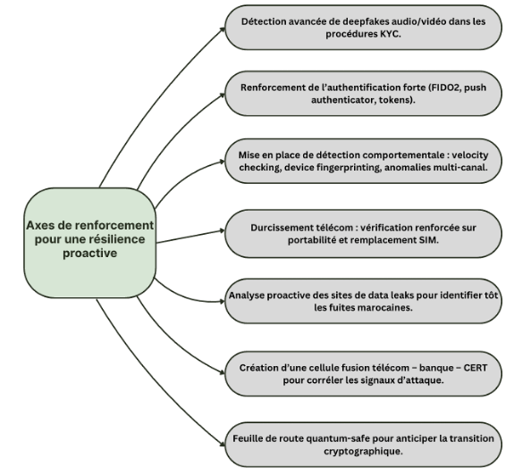 En parallèle, une veille proactive des plateformes de data leaks devient indispensable pour identifier rapidement la présence de données marocaines exposées et réagir avant qu’elles ne soient exploitées. La création d’une cellule de fusion regroupant les opérateurs télécom, les banques et le CERT permettrait d’obtenir une vision consolidée des signaux d’attaque et de coordonner plus efficacement les réponses. Les procédures KYC doivent intégrer des mécanismes capables de détecter les deepfakes audio et vidéo, compte tenu de l’évolution rapide des outils de falsification. Enfin, une vision à long terme impose de préparer dès maintenant une transition vers des standards cryptographiques résistants aux menaces quantiques afin de garantir la résilience future des systèmes sensibles.