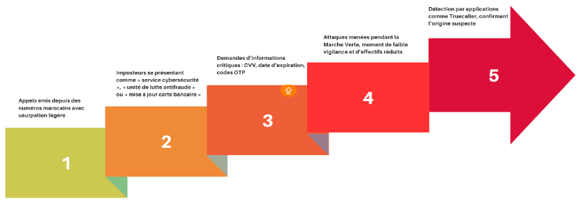 Cette donnée enrichie se convertit rapidement en un vecteur d’ingénierie sociale. Il a été constaté que de nombreux citoyens ont déjà été la cible d’appels téléphoniques frauduleux, se présentant comme émanant d’équipes de cybersécurité bancaire, et exploitant des informations exactes afin de susciter un sentiment d’urgence et d’authenticité. Il est à noter que certains de ces appels ont été effectués lors de périodes particulièrement sensibles, telles que la commémoration de la Marche verte ou pendant les week-ends, contribuant ainsi à renforcer l’impression d’un contact technique diligenté par un service informatique d’astreinte. La crédibilité de ces scénarios dépend davantage de la gestion des données que de compétences techniques complexes.