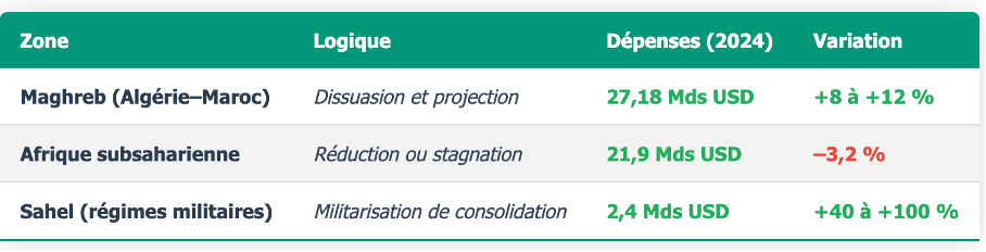Dans ce cadre, l’Afrique présente une caractéristique unique : malgré qu’elle ne constitue que 1,9 % des dépenses globales, elle est le théâtre d’une mutation militaire sous-jacente, éclatée mais importante. Deux approches se confrontent : d’une part, une consolidation progressive organisée dans le nord du continent (surtout en ce qui concerne la rivalité entre l’Algérie et le Maroc), de l’autre, une militarisation opportuniste et parfois chaotique au sein des États sahéliens dirigés par des juntes.
