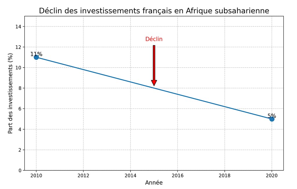 En revanche, les investissements de la France en Afrique subsaharienne sont en net déclin. Entre 2010 et 2020, la part des investissements français dans la région est passée de 11 % à environ 5 %. Bien que la France continue d’investir, les flux d’investissements directs étrangers (IDE) ont fortement diminué, en partie à cause des critiques sur l’intervention militaire française. Les investissements français restent concentrés sur des secteurs traditionnels comme les mines et l’énergie.